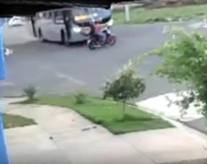 Imagens de uma câmera de videomonitoramento registraram o momento em que uma motocicleta, ocupada por duas pessoas, é atingida por um ônibus em Três Lagoas. O sinistro ocorreu na última quinta-feira (23).