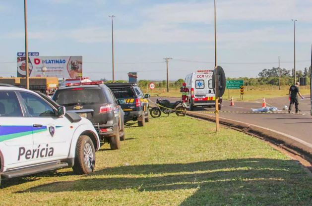 Motociclista ainda não identificado morreu após ser atropelado por uma carreta bitrem na tarde deste sábado (11), na rotatória da BR-163, saída de Campo Grande para São Paulo.