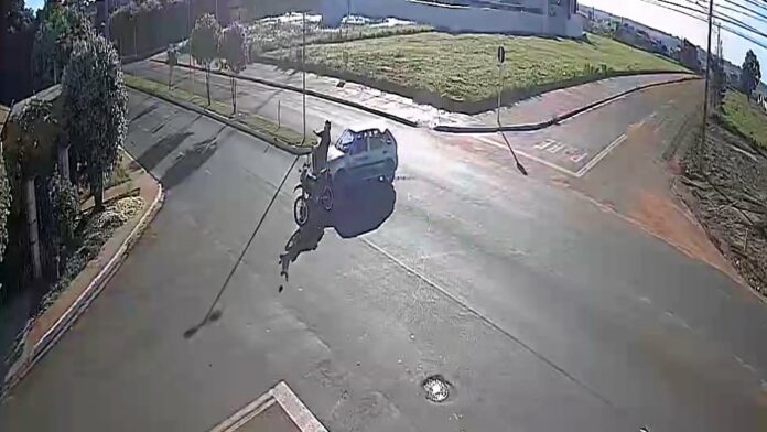 Imagens de câmera de videomonitoramento registraram o momento em que um veículo invade uma via, em Ivinhema, e atinge uma motociclista, que vai parar e cima do capô do carro.