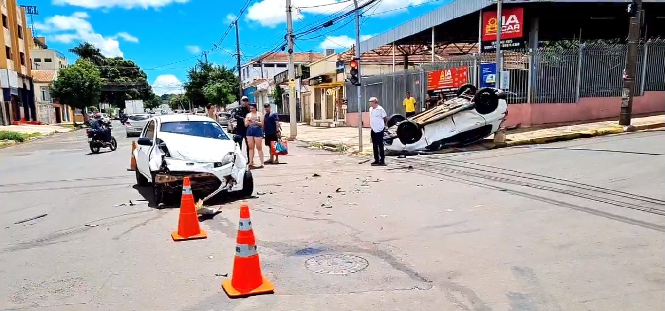 Um veículo capotou no início da tarde deste sábado (28), no centro de Campo Grande, após bater contra um carro que avançou o sinal vermelho em alta velocidade.