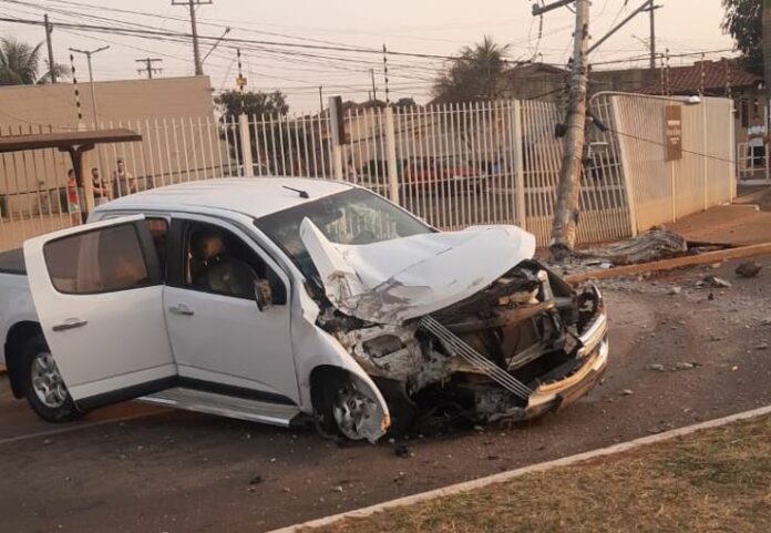 A frente do carro ficou totalmente destruída. Já poste acabou caindo sobre uma cerca metálica.