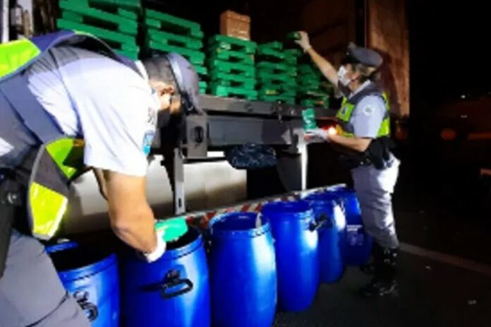 Durante entrevista, o caminhoneiro apresentou contradições e em uma busca no compartimento de carga do caminhão foram encontrados seis tambores e dentro deles haviam 120,4 quilos de maconha e mais 4,1 quilos de crack.