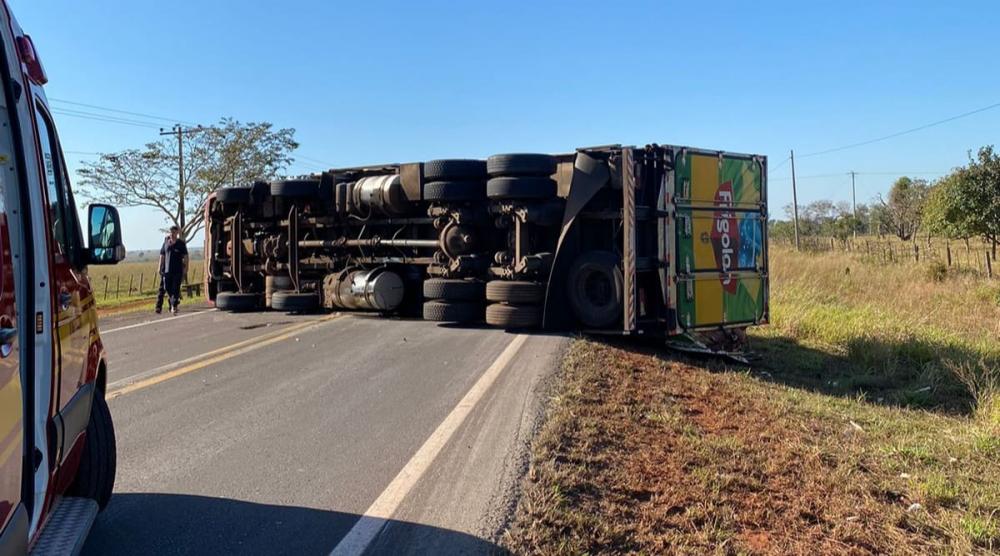 Um caminhão frigorífico acabou tombando na manhã dessa terça-feira (27) na rodovia estadual MS-338, em Santa Rita do Pardo. Segundo as informações do próprio motorista, ele perdeu o controle da direção ao desviar de um tamanduá-bandeira que estava atravessando a pista.