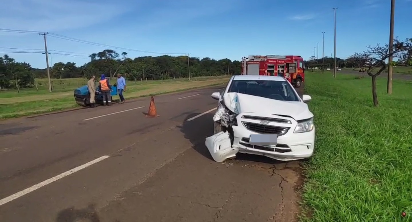 Um veículo bateu de frente contra uma rolo compreesor na tarde desta sexta-feira (12), em Campo Grande. A motorista, de 27 anos, sofreu apenas escorições leves, mas precisou ser levada para avaliação médica na Santa Casa.