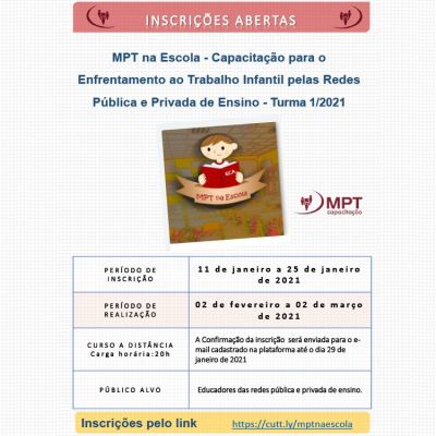 O curso visa capacitar educadores para implementarem o projeto MPT na Escola em suas unidades. “O escopo do projeto é levar a temática do trabalho infantil (definição, marcos legais, formas de exploração, causas e consequências, entre outros aspectos) para a sociedade, por intermédio da comunidade escolar”, explica a coordenadora nacional de Combate à Exploração do Trabalho da Criança e do Adolescente do Ministério Público do Trabalho (MPT), Ana Maria Villa Real.