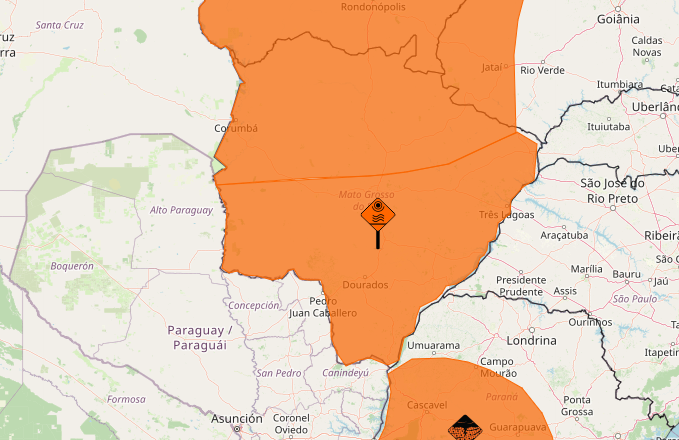 O alerta abrange Campo Grande e mais as cidades de Água Clara, Amambai, Anastácio, Anaurilândia, Angélica, Antônio João, Aquidauana, Aral Moreira, Bandeirantes, Bataguassu, Batayporã, Bela Vista, Bodoquena, Bonito, Brasilândia, Caarapó, Camapuã, Caracol, Corguinho, Coronel Sapucaia, Corumbá, Coxim, Deodápolis, Dois Irmãos do Buriti, Douradina, Dourados, Eldorado, Fátima do Sul, Figueirão, Glória de Dourados e Guia Lopes da Laguna.