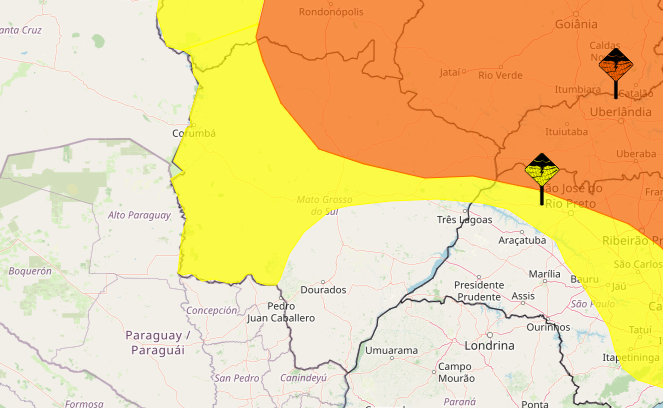No outro alerta, a previsão aponta para chuva entre 30 a 60 mm/h ou de até 100 mm/dia, acompanhada por ventos intensos que podem chegar até 100 km/h. Estão listadas as cidades de Água Clara, Alcinópolis, Aparecida do Taboado, Aquidauana, Bandeirantes, Camapuã, Cassilândia, Chapadão do Sul, Corguinho, Corumbá, Costa Rica, Coxim, Figueirão, Inocência, Paraíso das Águas, Paranaíba, Pedro Gomes, Ribas do Rio Pardo, Rio Negro, Rio Verde de Mato Grosso, São Gabriel do Oeste, Selvíria, Sonora e Três Lagoas.