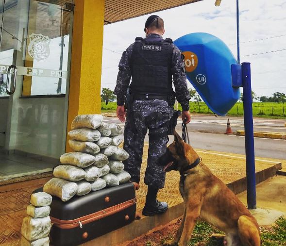 Segundo registro policial, uma equipe do Canil do Choque foi acionada para dar apoio no posto da PRF na BR-163, em Campo Grande, onde com auxílio dos cães, foram localizados em uma mala 24 tabletes de maconha e quatro de haxixe.