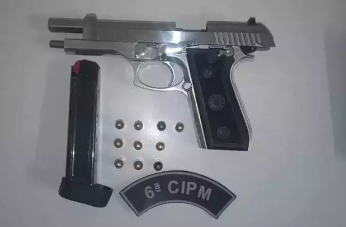 Hoje, por volta das 3h, após uma denúncia, a mulher de 31 anos que conduzia uma caminhonete Toyota Hilux foi abordada e no interior do veículo localizado a pistola carregada com 10 munições.
