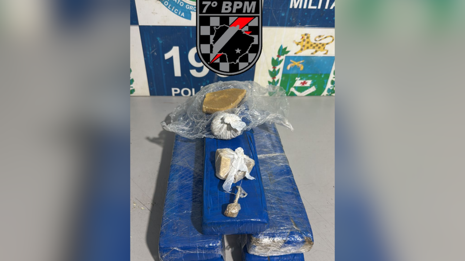 A equipe da Força Tática escavou o local e se deparou com vários sacos pretos enrolados em cinco tabletes de maconha, que pesados totalizaram 4,312 kg.