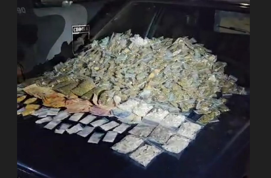 No interior da casa, foram achados vários porções de maconha e também de cocaína, que estavam em uma bolsa com pertences femininos, além de um documento da mulher detida.