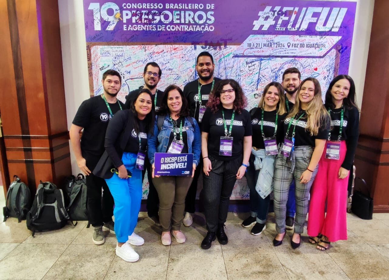 #pratodosverem. A imagem mostra dez servidores da Secomp em foto pousada na frente do painel do 19° Congresso Brasileiro de Pregoeiros. Seis mulheres estão a frente, todas são de pele clara. Três delas possuem cabelos pretos, duas são loiras e uma possui cabelos vermelhos. Todas estão com blusas pretas. Os quatro homens estão posicionados atrás das mulheres, todos estão vestidos de camisetas pretas, pele clara e cabelos negros.