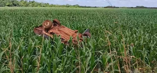 Devido ao impacto, o motorista perdeu o controle da direção e o carro acabou capotando várias vezes até parar com as rodas para cima no meio da vegetação.