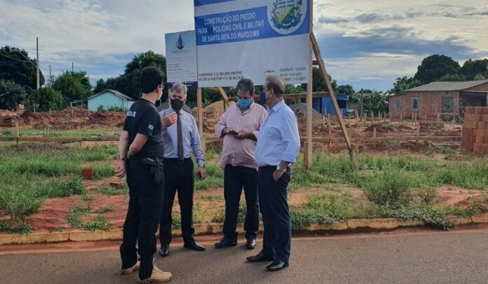 O secretário de Estado de Justiça e Segurança Pública, Antonio Carlos Videria, e o prefeito de Santa Rita do Pardo, Cacildo Dagno, acompanhados do delegado-geral da Polícia Civil, Marcelo Vargas, e o delegado Caique Ducatti, visitaram esta semana as obras da nova Delegacia da Polícia Civil no município.