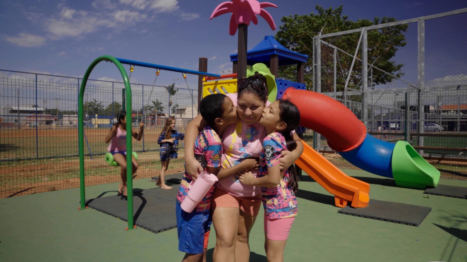 “É importante demais ter esse parquinho aqui. Antes a gente tinha que ir longe para levar os filhos para brincar. Meu filho mais velho ama jogar bola e agora a gente tem tudo pertinho: o campo, o parquinho”, completa a mãe toda feliz.