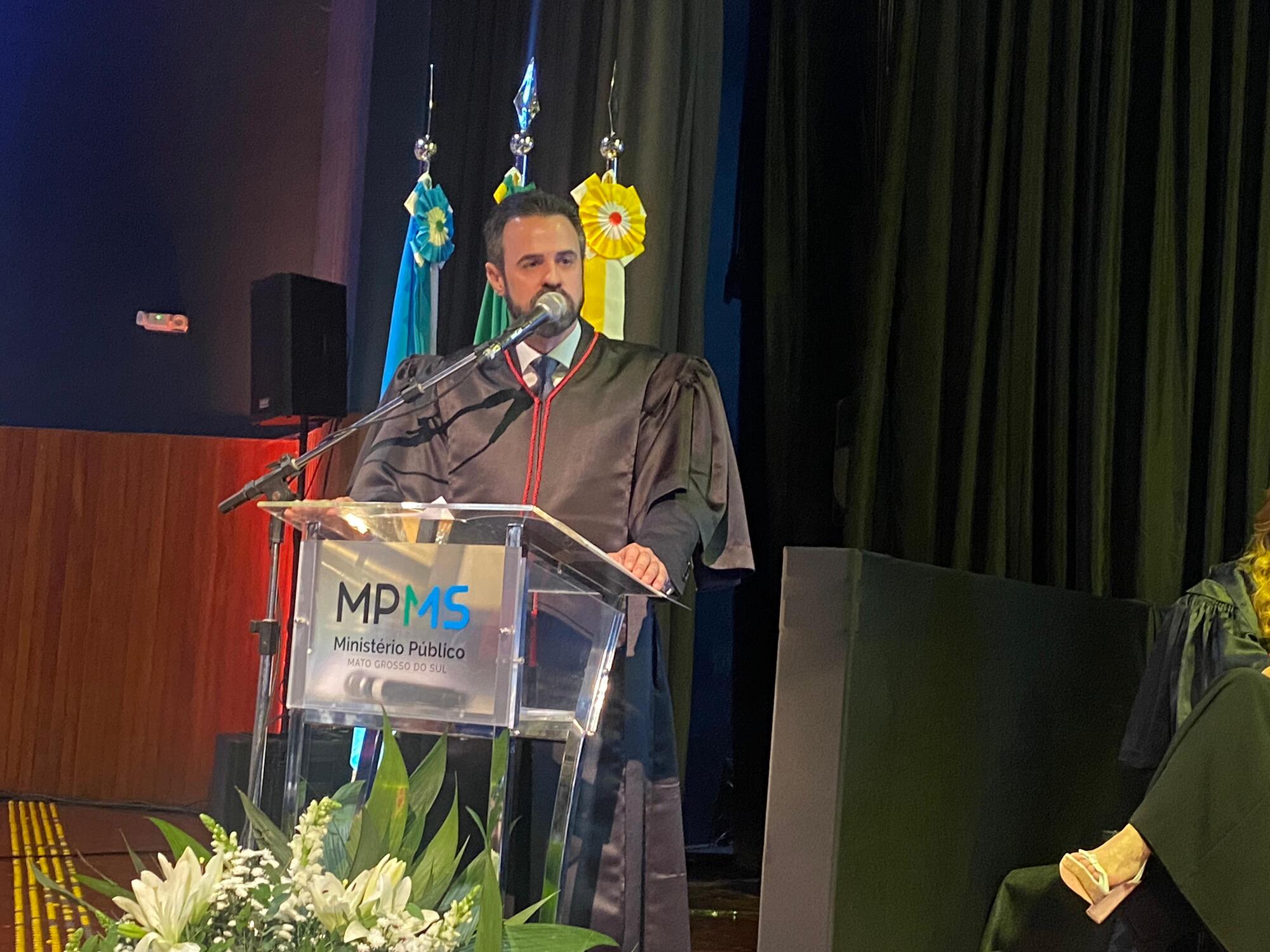 A solenidade teve início às 18h30 e contou com a presença de importantes figuras da justiça e da política estadual. O destaque ficou para o governado de Mato Grosso do Sul, Eduardo Riedel, que discursou parabenizando o novo chefe do Ministério Público Estadual.