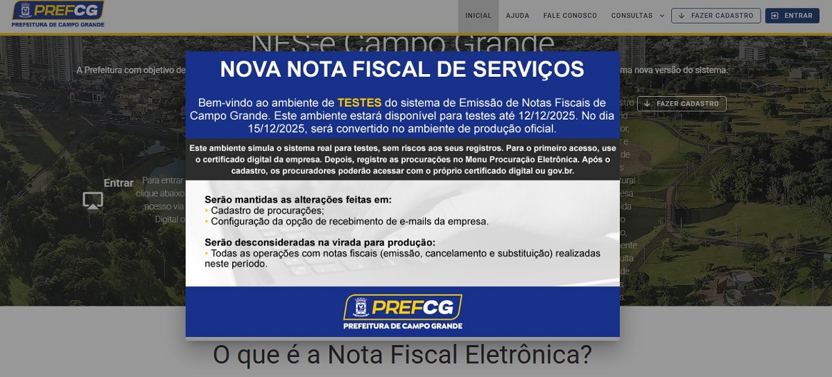 A Prefeitura de Campo Grande inicia a implantação de um novo sistema de emissão de Nota Fiscal de Serviços Eletrônica (NFS-e), que será mais rápido, estável e seguro. A partir das 18h desta sexta-feira (12), o sistema atual será desativado temporariamente para migração à nova plataforma, que estará disponível a partir das 6h da manhã da próxima segunda-feira (15). Durante esse intervalo, não será possível emitir notas fiscais. A mudança é necessária para garantir melhorias como mais agilidade no processamento, estabilidade no acesso e aumento da segurança digital.