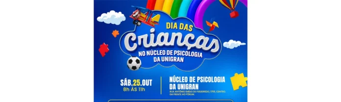 O Núcleo de Psicologia da UNIGRAN realizará, no próximo sábado, 25 de outubro, das 8h às 11h, uma programação especial em comemoração ao Dia das Crianças. O evento, gratuito e aberto à comunidade, será realizado na Rua Antônio Emílio de Figueiredo, 1755, em frente ao Fórum, e reunirá atividades recreativas, orientações de saúde e ações educativas que fortalecem os vínculos familiares e comunitários.