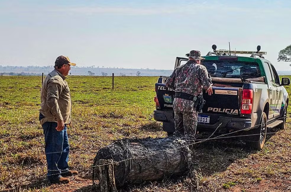 Policiais militares ambientais recolheram o objeto e entregaram na Gerência Municipal de Meio Ambiente de Naviraí — Foto: Divulgação/PMA