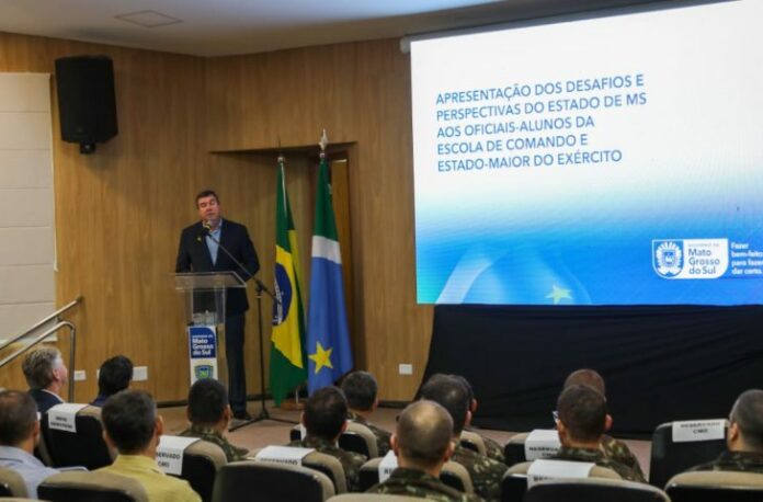 O governador Eduardo Riedel destacou aos militares uma visão estratégica do Estado, abordando as características sócio-econômicas de Mato Grosso do Sul, além das potencialidades, principais desafios e perspectivas para os próximos anos. Riedel ainda afirmou que o papel do governo é oferecer ao setor privado um ambiente de negócios, atraindo investimentos e operações robustas dentro do Estado, como nos setores de celulose, agroindústria e bioenergia.