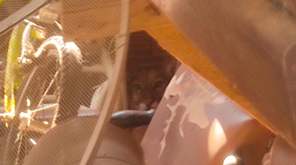 Segundo ele, o felino estava acuado, escondido atrás de partes de sofás, já que no local também funciona uma tapeçaria.