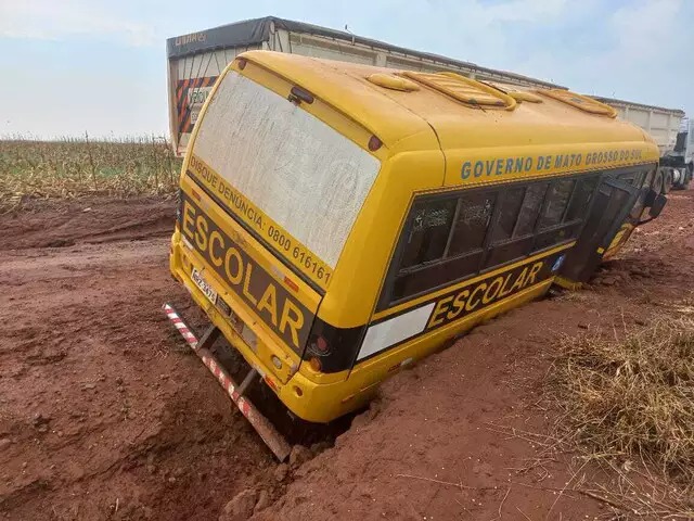 Ônibus escolar cai dentro de vala em estrada vicinal no interior de MS