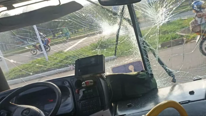 Um ônibus do Consórcio Guaicurus ficou com o para-brisa danificado ao bater contra a traseira de um caminhão na Avenida Gunter Hans, próximo ao Hospital Regional.