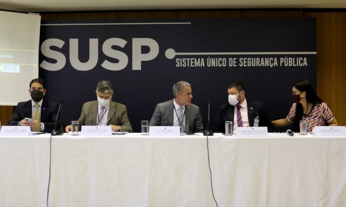 Ministério da Justiça e Segurança Pública apresenta resultados da Operação Vetus II. Julio Danilo Souza Ferreira, Presidente do Conselho Nacional dos Secretários de Segurança Pública, Carlos Alberto Fazzio, Coordenador-Geral de Planejamento Operacional do MJSP, Alfredo Carrijo, Secretário de Operações Integradas do MJSP, Vandervaldo Gonçalves Lima, Coordenador-Geral da Ouvidoria Nacional de Direitos Humanos do MMFDH, Fernanda Antonucci, delegada da Polícia Civil do Amazonas.