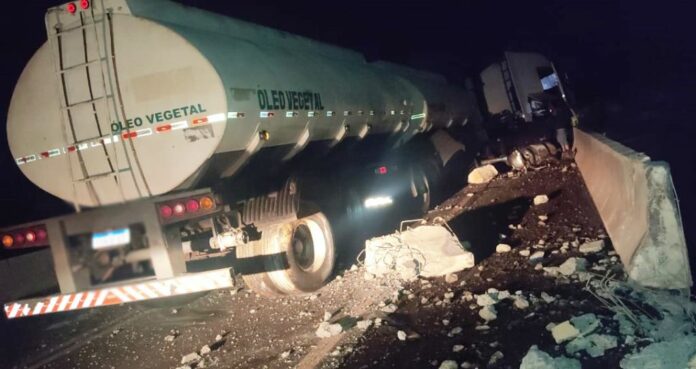 Uma caminhão Volvo/FH 400 com placas de Andradina (SP), tracionando um bitrem tanque com placas de Dourados, colidiu na noite de ontem (23), na mureta da ponte sobre o Córrego do Baile, na MS-134, segunda alça do anel viário, em Nova Andradina. Ele saiu ileso da colisão e disse que evitou um acidente frontal com outro veículo.