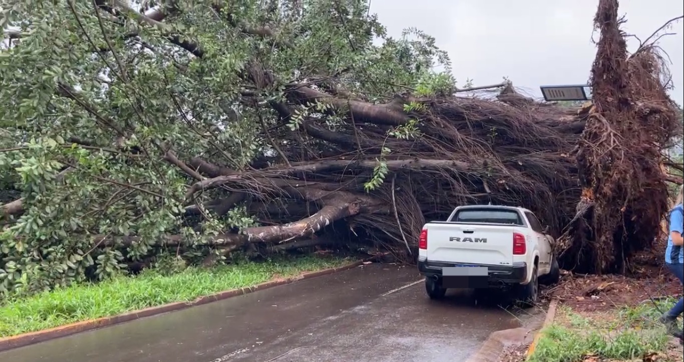 A imagem da árvore gigantesca no chão chamou a atenção. Pelo menos um veículo ficou totalmente destruído, já que está debaixo do tronco. Uma caminhonete teve a parte frontal atingida pelos galhos. Não há informações sobre vítimas.