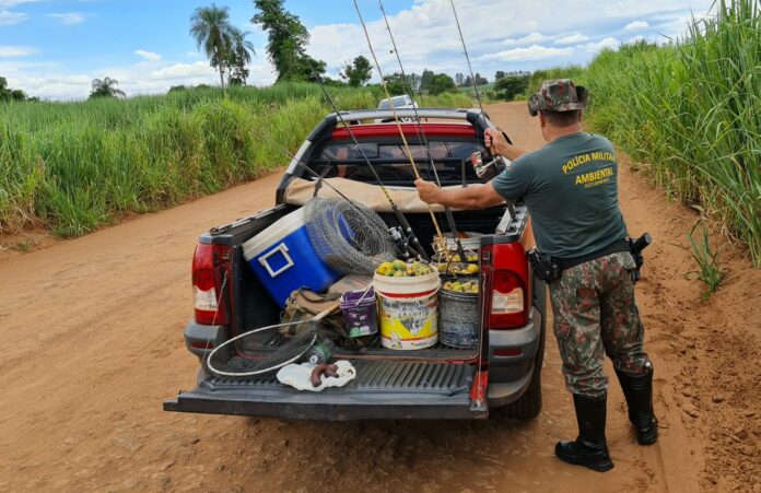 Com ele foram apreendidos quatro varas de pesca com molinetes, uma vara de bambu, covo (petrecho ilegal), quatro baldes com manga madura para trato (ceva); 1 kg de quirela de milho e larvas de insetos para iscas, uma caixa térmica e uma bolsa de pesca contendo vários anzóis, chumbadas e linhas.