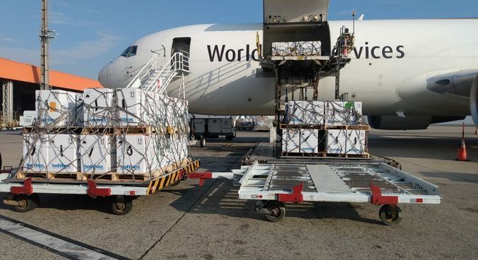 A Pfizer divulgou neste domingo (5) a chegada de mais um lote de vacinas contra a covid-19 no aeroporto de Viracopos, em Campinas (SP), com 1.146.600 doses. A previsão é que às 15h15 outra aeronave aterrisse com 1.141.920 doses, totalizando 2.288.520 doses.