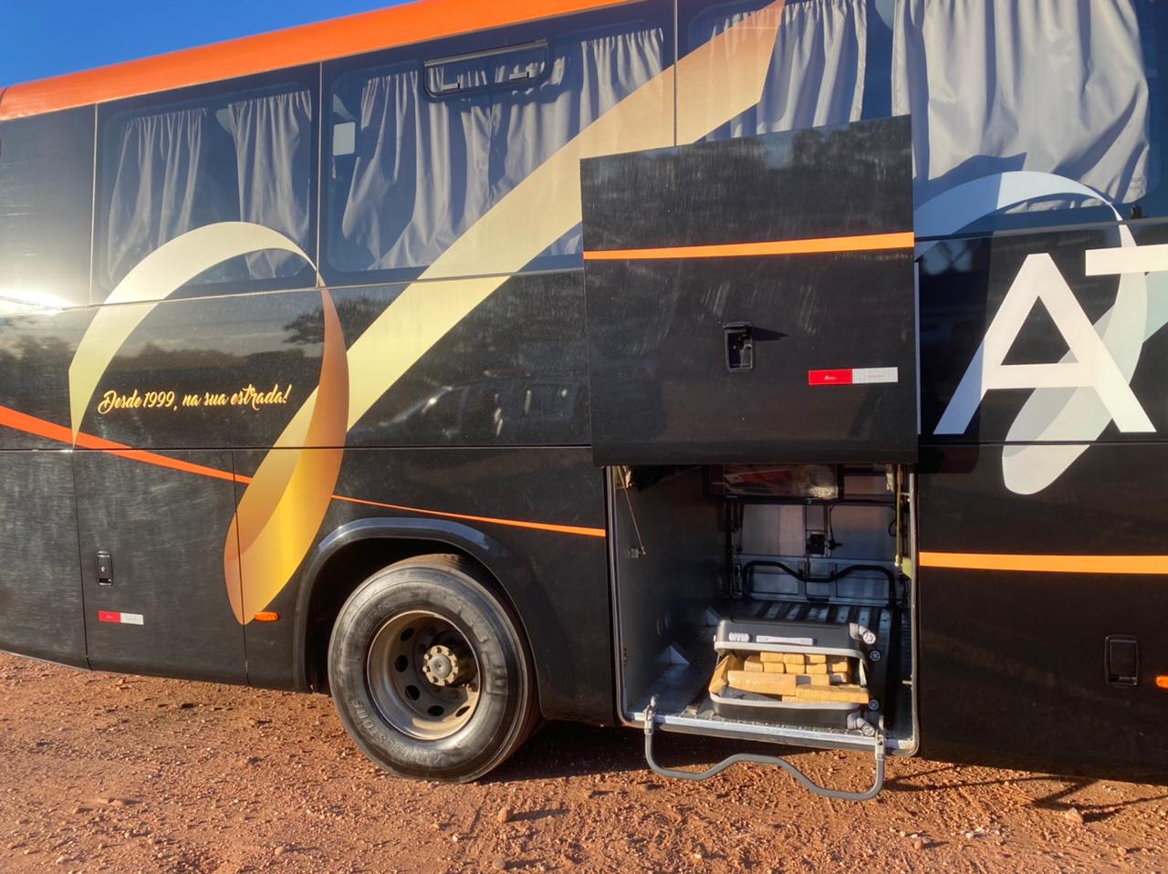 Durante a vistoria no compartimento de bagagens, os policiais localizaram uma mala de cor preta contendo diversos tabletes de maconha embalados.