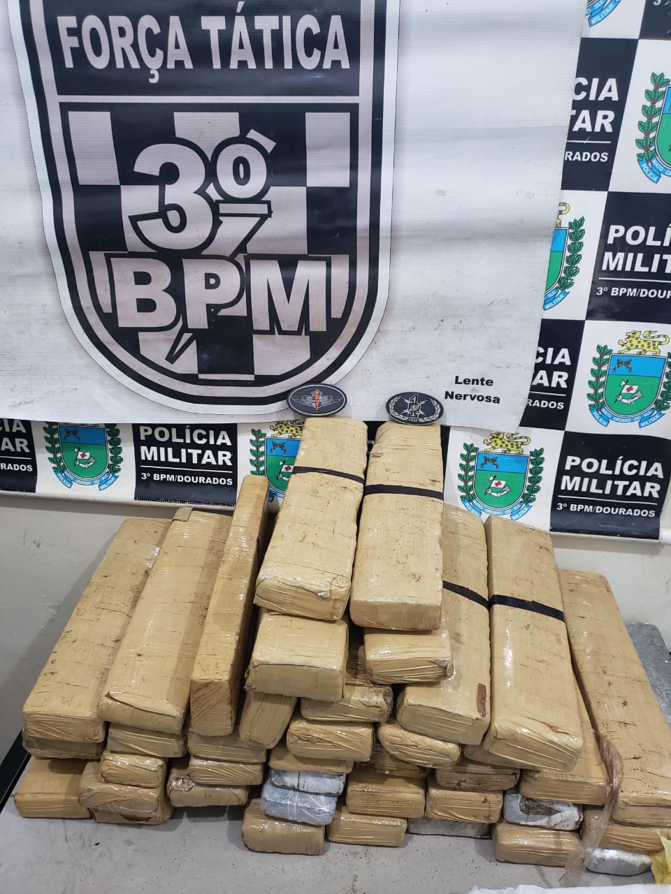 A Força Tática realizou a abordagem e nas bolsass foram localizados 42 tabletes de maconha.