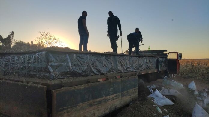 Ainda no barracão, foi localizado um caminhão Chevrolet C60, cor laranja, coberto por uma camada de “cama de frango”, porém ao ser inspecionado embaixo do material, os policiais localizaram mais fardos da droga, estes já estavam prontos para o transporte.