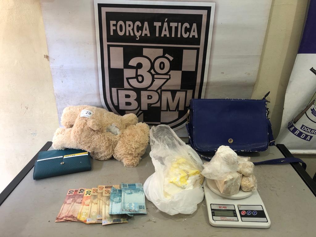 A primeira ocorrência, equipe da Força Tática recebeu denuncia que uma moradora de 26 anos do residencial Eucalipto, na Rua Hatsujiro Kudo, estaria realizando a venda e depósito de drogas de um presidiário identificado como “Erzão”.