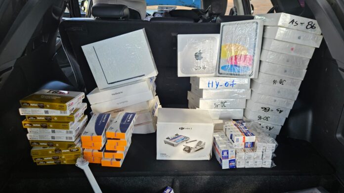 Nos compartimentos localizados no assoalho do porta-malas e nas laterais traseiras, os policiais encontraram uma grande quantidade de produtos trazidos do Paraguai sem documentação fiscal. Ao todo, foram apreendidos 15 iPads, 10 MacBooks, um notebook HP, um Mac Mini e cerca de 110 unidades de medicamentos emagrecedores à base de tirzepatida, transportados sem refrigeração, em desacordo com normas sanitárias.