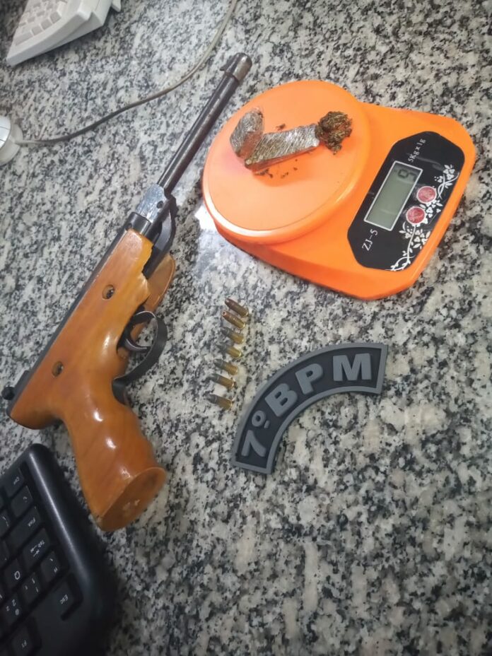 Após busca pessoal e no veiculo, foi encontrado uma arma calibre .22 escondida dentro de uma mochila e uma porção de substância análoga a maconha.