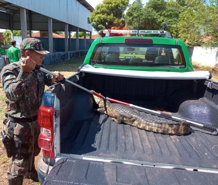 Um jacaré foi capturado por policiais militares ambientais nesta terça-feira (22) enquanto passeava dentro de uma escola, em Miranda.