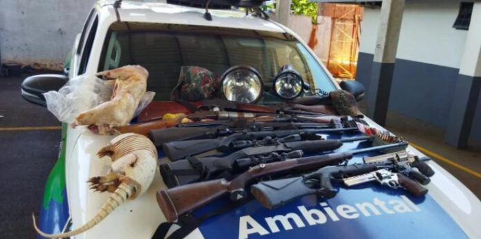 Oito caçadores foram presos e dois adolescentes apreendidos ontem (5), durante fiscalização da Polícia Militar Ambiental (PMA) em acampamento improvisado às margens da MS-160, entre Sidrolândia e Maracaju. No local onde os suspeitos estavam, os militares apreenderam 12 armas de fogo, entre rifles, espingardas, revólveres, muita munição, veículos e animais abatidos.