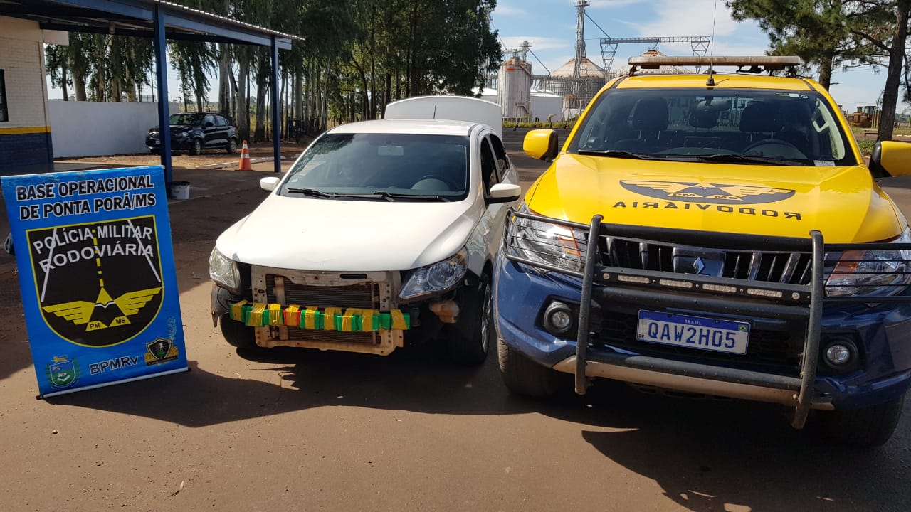 A PMR (Polícia Militar Rodoviária) apreendeu nesta terça-feira (25) um veículo com placas de Mirassol/SP, que estava “recheado” com drogas, sendo transportada por um jovem de apenas 21 anos. A ação foi durante a Operação Hórus, desencadeada pela Sejuso/MS e pela Secretaria Nacional de Operações Integradas do Ministério de Justiça e Segurança Pública. O produto estava instalado por todo o carro, sendo descoberto nos para-choques dianteiro e traseiro, nas laterais, embaixo do banco traseiro e nas portas.