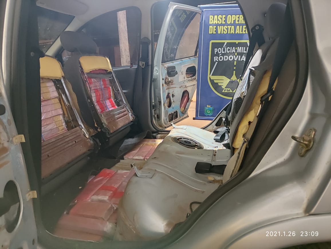 Durante abordagem a um veículo GM Classic com placas de Água Clara, em conferência aos equipamentos obrigatórios, os policiais militares encontraram no porta malas diversos tabletes de maconha, posteriormente também foram encontrados escondidos em diversos pontos do veículo como, dentro da caixa de som, nos encostos dos bancos e interior das portas. Ao todo foram apreendidos 260 tabletes do entorpecente.