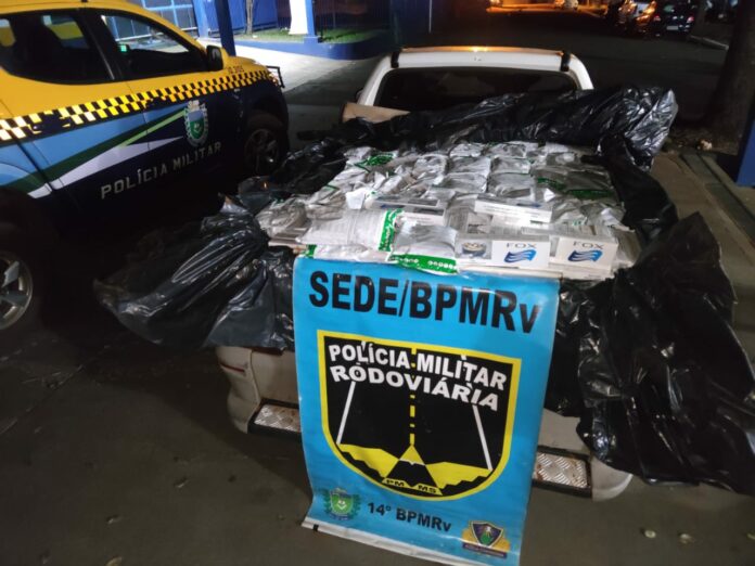 “Ao vistoriar a carroceria do veículo foram encontrados 500 pacotes de cigarros e 200 quilos de agrotóxicos/inseticidas da marca Timerol Xtra. No veículo ainda tinha um rádio comunicador clandestino”, registrou a PMR.