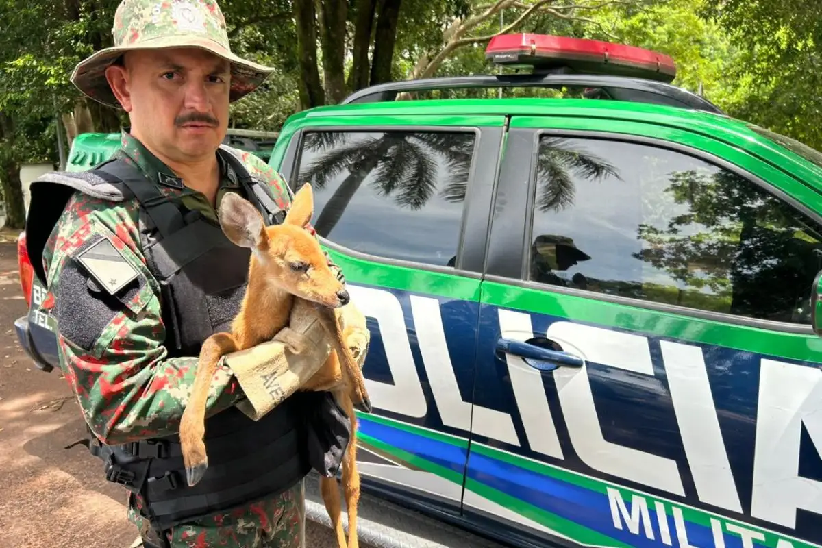Equipes da Polícia Militar Ambiental (PMA) foram acionadas imediatamente e realizaram os primeiros atendimentos, fornecendo água e cuidados básicos para estabilizar o cervo antes de transportá-lo com segurança. Segundo os policiais, o animal apresentava sinais evidentes de desidratação e corria risco devido ao intenso fluxo de veículos no local.