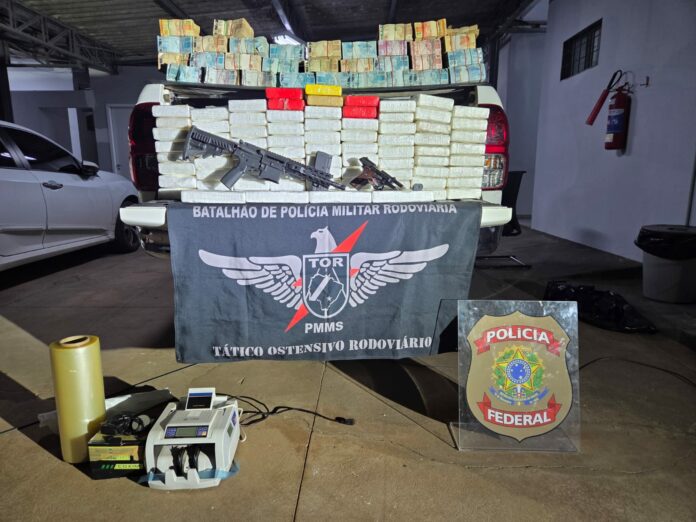 Com isso, foi realizada a abordagem e a revista no interior da casa, encontrando 88,5 kg de cocaína, R$ 1.722.785,00 em dinheiro de espécie, além de um fuzil Colt cal. 556 e uma pistola cal. 380, com 15 munições intactas.
