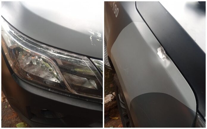 Viatura atingida pelos tiros (Foto: PMMS)