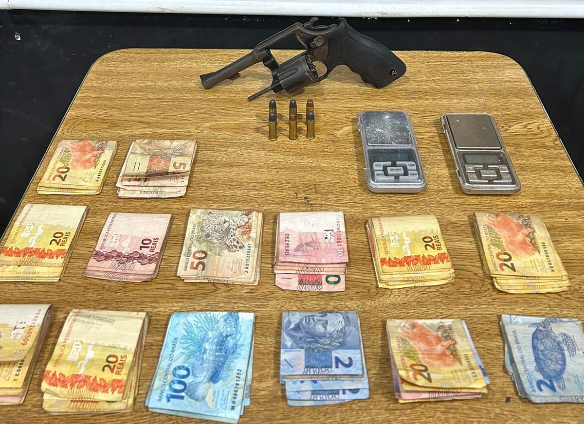 Também foram localizados cerca de R$ 2,5 mil, duas balanças de precisão e uma máquina de cartão de crédito. Ao ser questionado, o indivíduo tentou se esquivar, alegando que o armamento seria de seu irmão.