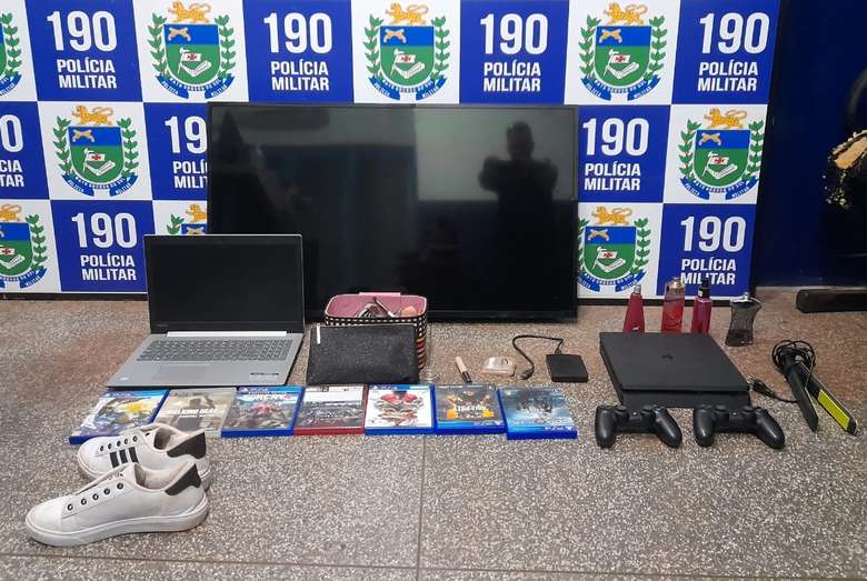 Foi recuperado uma TV 43 polegadas, um notebook Lenovo, um videogame Playstation 4, controles, jogos, HD, perfumes, chapinha e uma bolsa contendo kits de maquiagem e acessórios de beleza, além de um par de tênis.