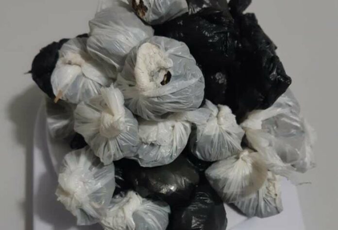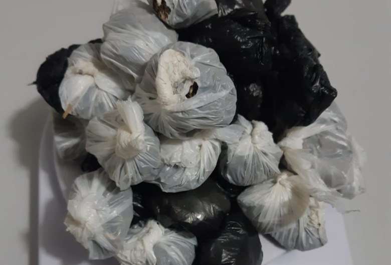 Com o apoio de outros policiais militares, conseguiram encontrar uma sacola plástica com drogas, que estava em um matagal nas proximidades do barraco da mulher. Dentro da sacola, foram localizadas 43 porções de maconha, pesando ao todo 187 gramas.