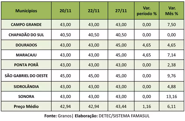 De acordo com as cotações disponíveis no site da Granos Corretora, as maiores valorizações no período ocorreram nos municípios de Maracaju e Dourados, com valorização nas ordens de 4,65% e 4,65%, respectivamente. O valor médio para o período foi de R$ 43,10/sc.